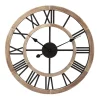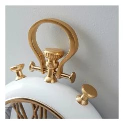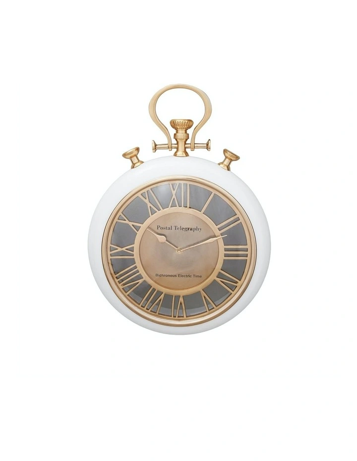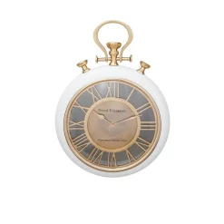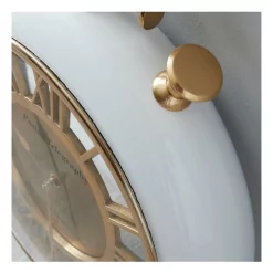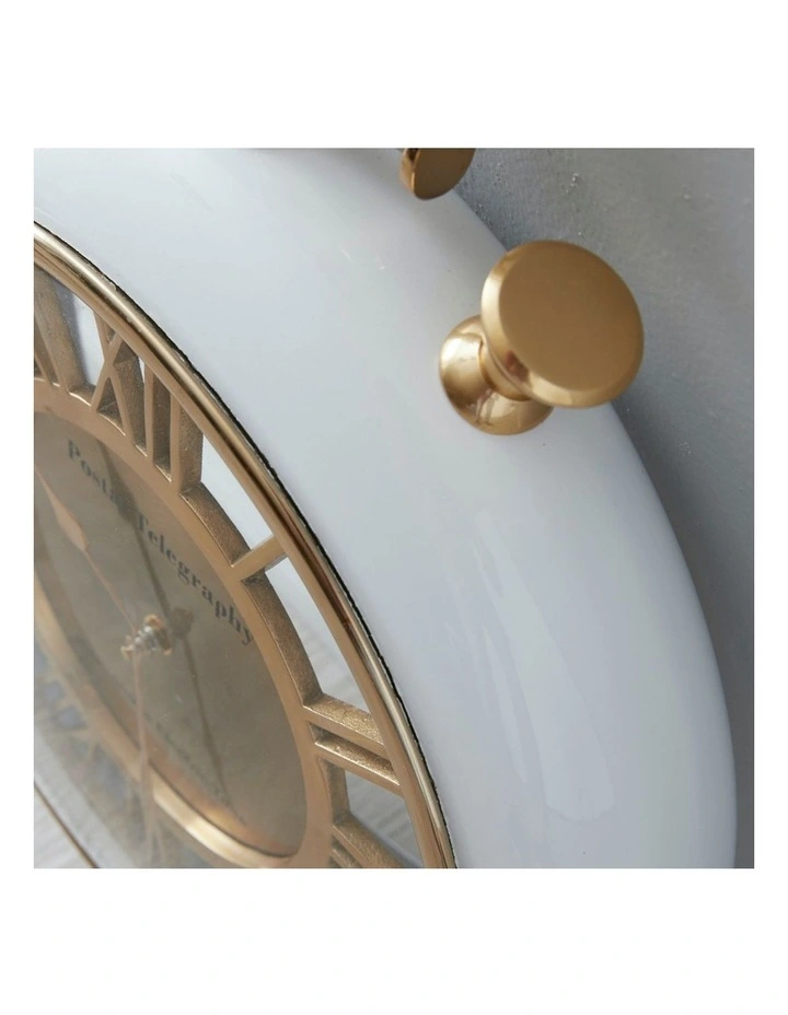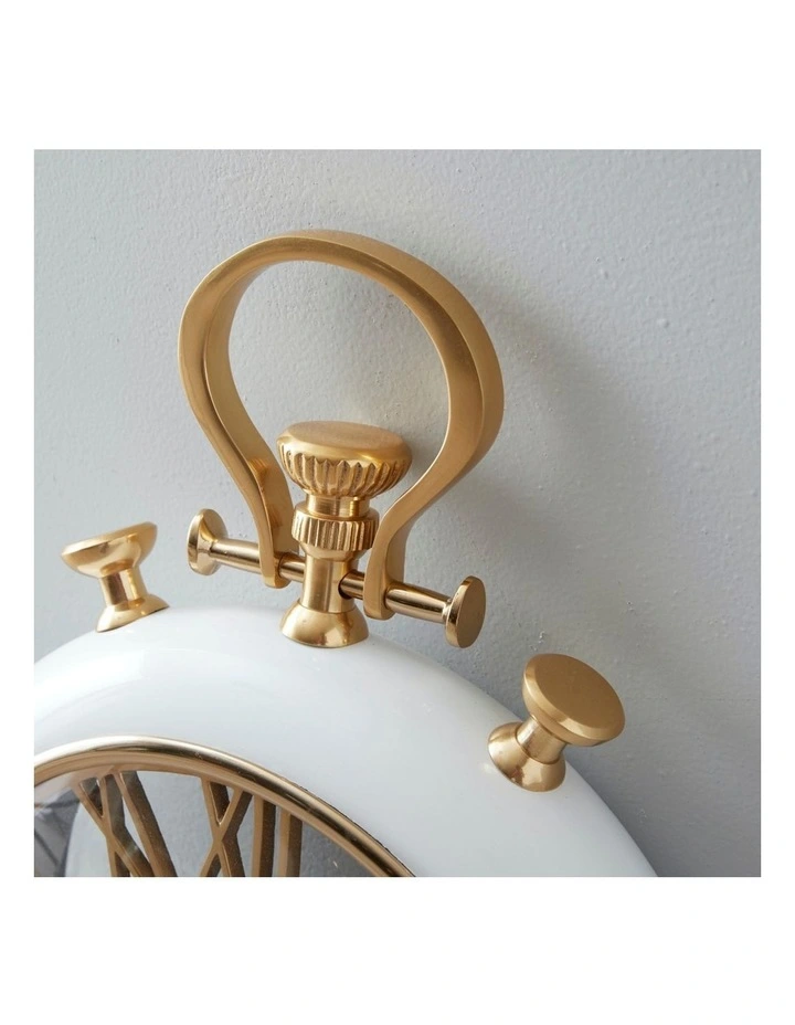 Matte white steel clock with antique brass detailing and a roman numeral display.