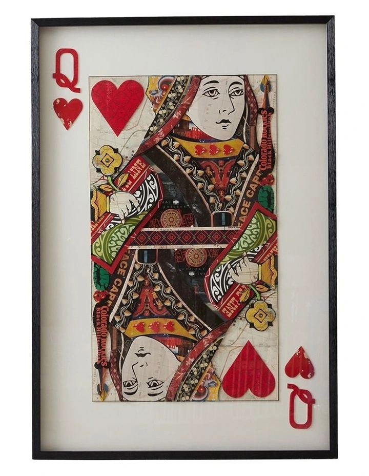 The Queen of Hearts Paper Collage gives a fresh look to the all too familiar card design. Features the Queen of Hearts full of colour and intricate detailing that gives it a revitalized look. It fills any space with character, especially when paired with our King, Joker and Ace of Hearts Paper Collage for a hearty royal set.