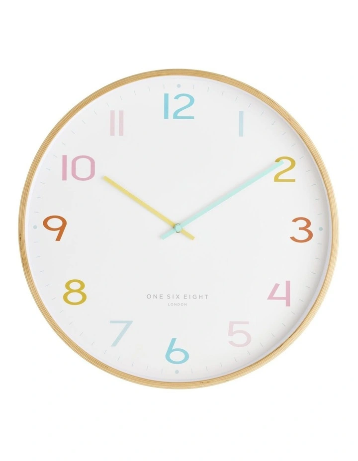 Slip into a daydream with our beautiful plywood case wall clock.Β Β In a fresh and pretty daytime palette, pure white face and rainbow drop coloured numerals this happy colourful clock will help you feel the joys of spring any month of the year.Β