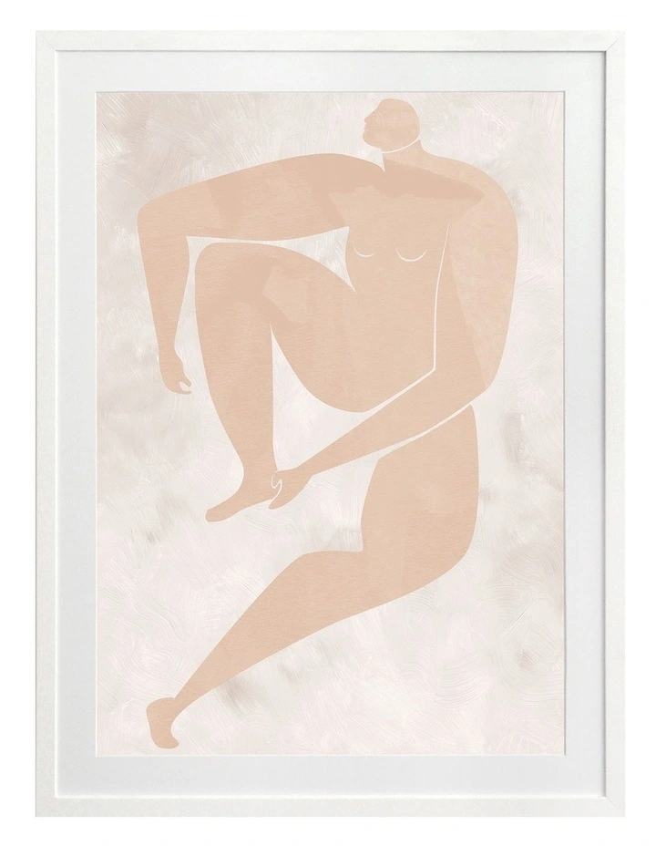 Amelie Cut-Out I Print White Frame – Drawing inspiration from the iconic cut-out style artwork from modern art master Matisse, this artwork features a simplistic, caricature-like portrait of a figure with exaggerated limbs. The colour palette is light and neutral, featuring a warm, nude-pink figure against a textured bone coloured background. This artwork has been created to match with Amelie Cut-Out II, III and IV.FRAMED ART: Giclee printed using archival inks and paper – which means no fading! Framed with a quality moulding and mounted behind museum grade plexiglass. Comes ready to hang.