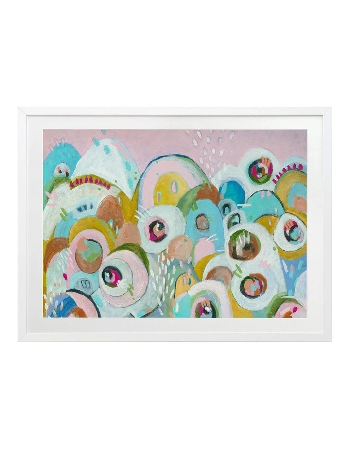 Big Blinky Print White Frame – A playful abstract landscape piece that is rich with layers in an earthy pastel palette of pink, blue, green and yellow. It heavily features the block colours, shapes and strokes that are prominent through the artist’s body of works. FRAMED ART: Giclee printed using archival inks and paper – which means no fading! Framed with a quality moulding and mounted behind museum grade plexiglass. Comes ready to hang.
