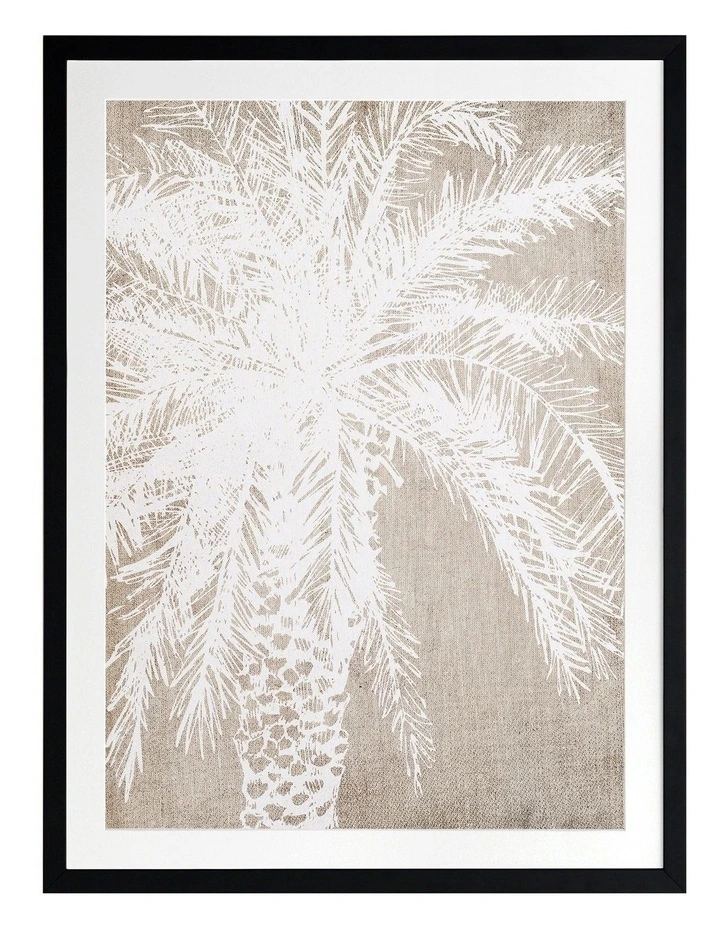 Canary Island I Print Black Frame – A relaxed, tropical lino print style artwork that showcases a brilliant white impression of a Canary Island Date Palm splayed out against a textured, warm beige background. FRAMED ART: Giclee printed using archival inks and paper – which means no fading! Framed with a quality moulding and mounted behind museum grade plexiglass. Comes ready to hang.