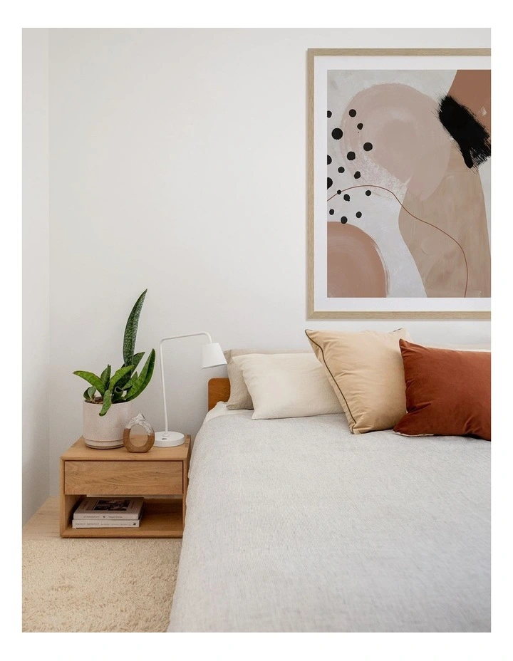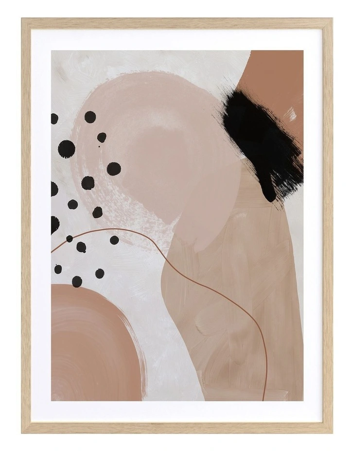 Creme Brulee II Framed Print: An organic, abstract artwork that features overlapping shapes, washes, lines and dots in a warm, neutral colour palette. Pairs with Creme Brulee I.FRAMED ART: Giclee printed using archival inks and paper – which means no fading! Framed with a quality moulding and mounted behind museum grade plexiglass. Comes ready to hang.