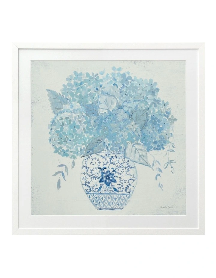 Ginger Jar Hydrangea Print White Frame – The more feminine side of the Hamptons style is showcased in this gentle and intricate blue-toned artwork featuring a floral arrangement in a ginger jar.FRAMED ART: Giclee printed using archival inks and paper – which means no fading! Framed with a quality moulding and mounted behind museum grade plexiglass. Comes ready to hang.
