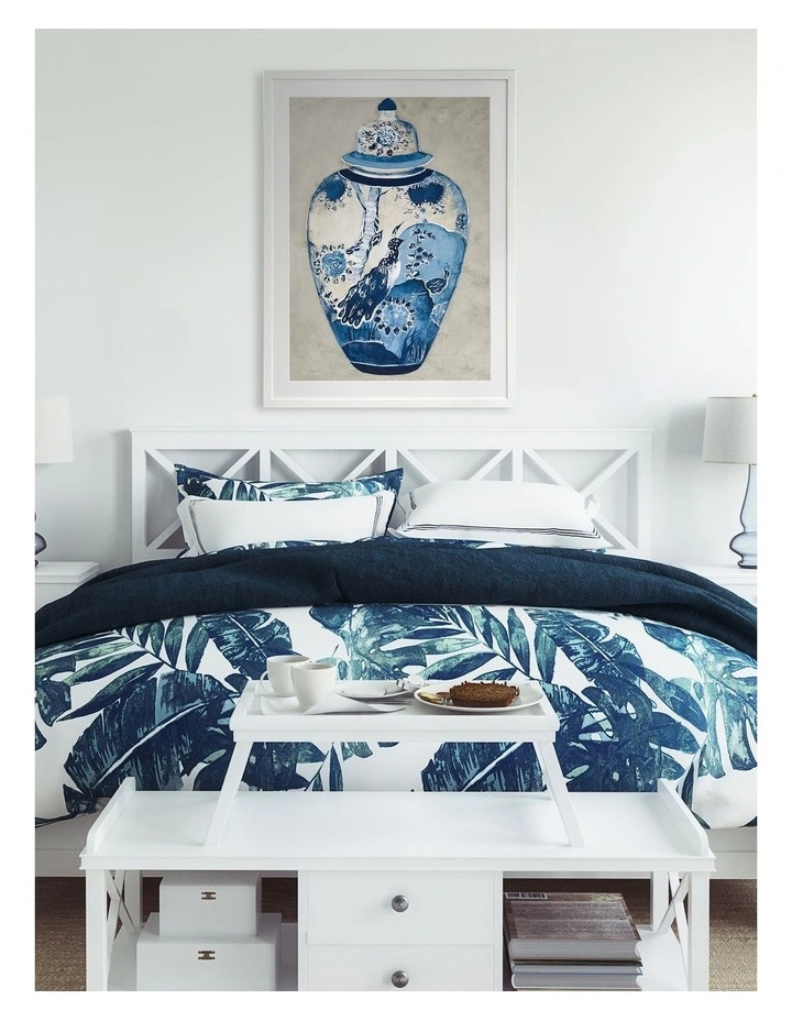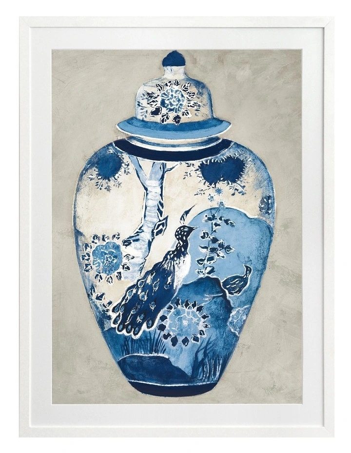 Orient II Print White Frame – Quintessential Hamptons chic comes to life in this incredible art print featuring an intricately painted ginger jar. The blue and white jar features ornate, floral motifs, and is contrasted against a textured grey background. Pairs with Orient I.FRAMED ART: Giclee printed using archival inks and paper – which means no fading! Framed with a quality moulding and mounted behind museum grade plexiglass. Comes ready to hang.