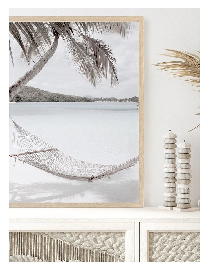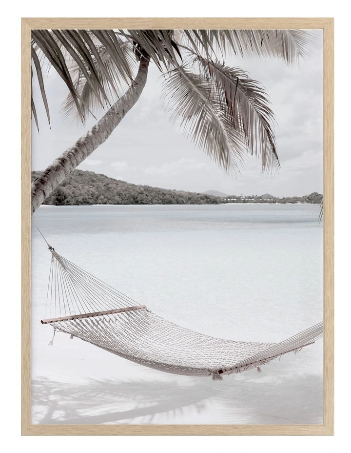 Rest Easy Print Oak Frame – Kick back and relax in a tropical oasis with this photographic print, featuring a hammock hung between two palm trees, overlooking a beautiful bay.FRAMED ART: Giclee printed using archival inks and paper – which means no fading! Framed with a quality moulding and mounted behind museum grade plexiglass. Comes ready to hang.
