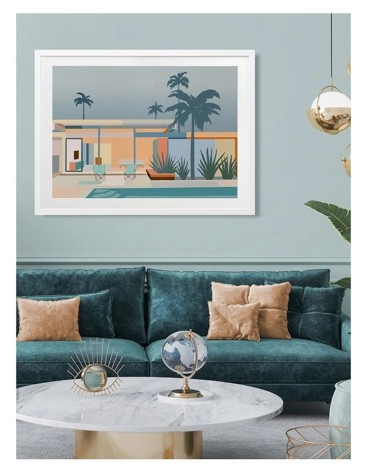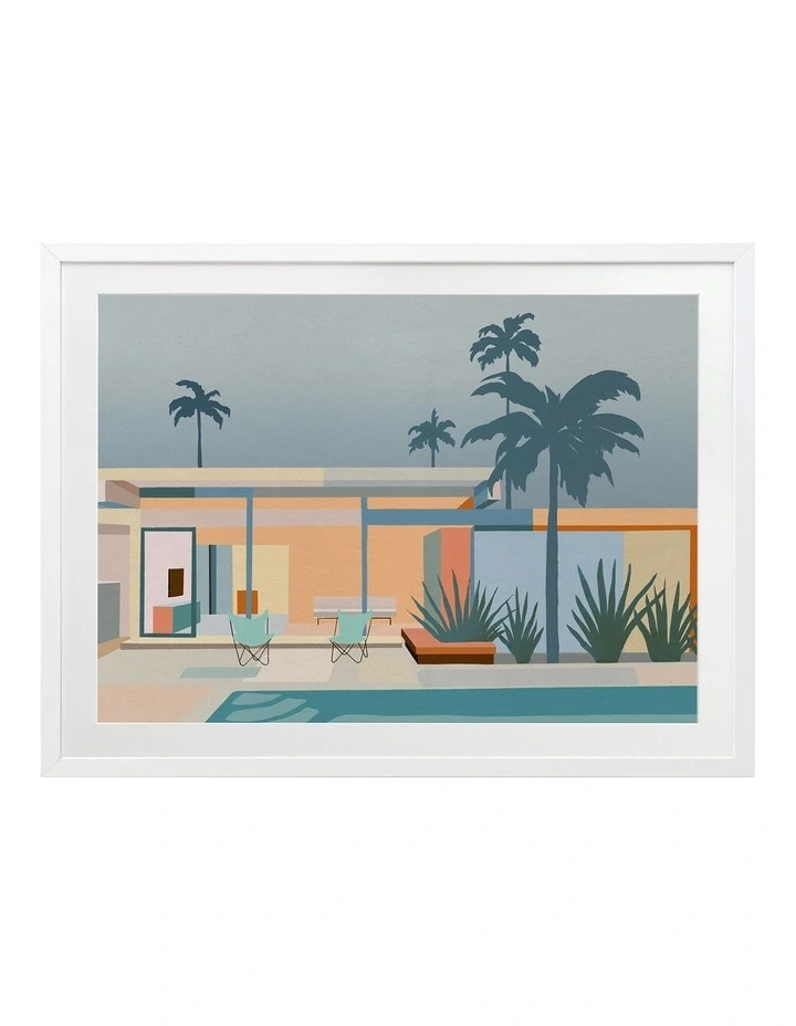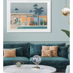 Serenity Street Print White Frame – A bright, playful illustration featuring the poolside patio of a Palm Springs style home in a beautifully contrasted blue and orange colour palette. FRAMED ART: Giclee printed using archival inks and paper – which means no fading! Framed with a quality moulding and mounted behind museum grade plexiglass. Comes ready to hang.