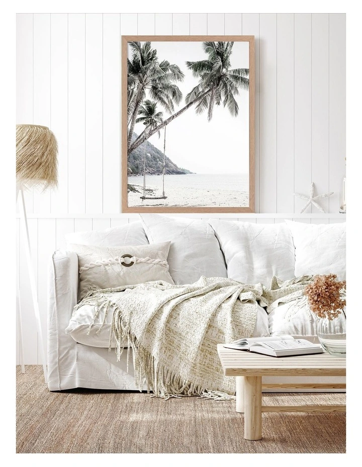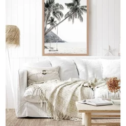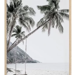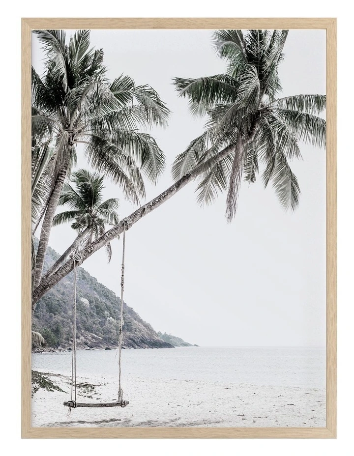 Swing Life Away Print Oak Frame – Make every day a holiday with this relaxed photographic print, featuring a rope swing hanging from a palm tree on a sandy beach overlooking the ocean.FRAMED ART: Giclee printed using archival inks and paper – which means no fading! Framed with a quality moulding and mounted behind museum grade plexiglass. Comes ready to hang.