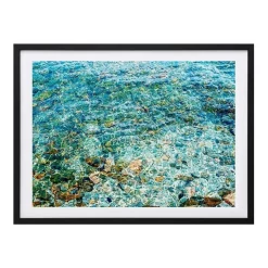 The Shallows Framed Print: A tranquil and intriguing artwork that depicts a painted, rippled rock pool in tones of aqua, blue and brown.FRAMED ART: Giclee printed using archival inks and paper – which means no fading! Framed with a quality moulding and mounted behind museum grade plexiglass. Comes ready to hang.