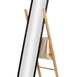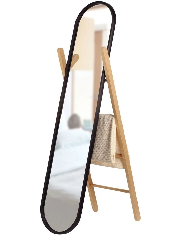The Hub Floor Mirror is a floor length vanity mirror that doubles as a storage rack to hold clothing, linens, and a variety of accessories. Made of a solid rubberwood easel-backed ladder in a natural finish with a black rubber rimmed mirror, Hub is functional for a variety of spaces, thanks to its compact size and thoughtful design.